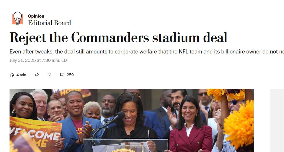 The Washington Post Editorial Board has urged the Council to “Reject the Commanders stadium deal” for its immense public subsidy. Read the editorial